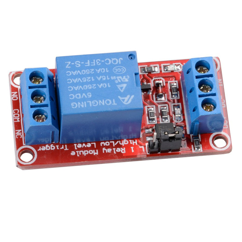 Relaismodule 1-kanaals 5V (1) Deze relaismodule is zeer gemakkelijk aan te sturen doormiddel van een Arduino (of andere microcontroller). Doordat dit relais op 5 volt werkt en slechts 4mA aan stroom nodig heeft, is een externe stroombron niet nodig. De 5V-pin van bijvoorbeeld een Arduino Uno levert meer dan genoeg stroom om deze module aan te sturen. Deze module bevat een NC, NO en COM contact. Doormiddel van een "high"of "low" signaal kan er gewisseld worden tussen NC en NO. De maximale stroom die dit relais aan kan is 250VAC/10A en 30VDC/10A. de 3 terminals waar de kabels naar binnen gaan, zijn voorzien van schroeven zodat de draden stevig kunnen worden vastgeklemd.