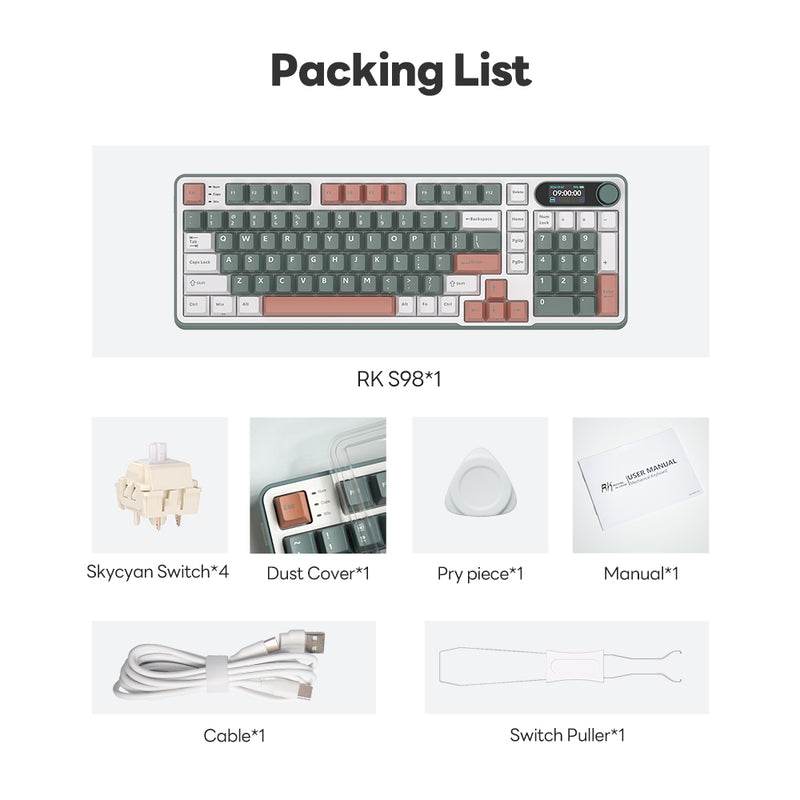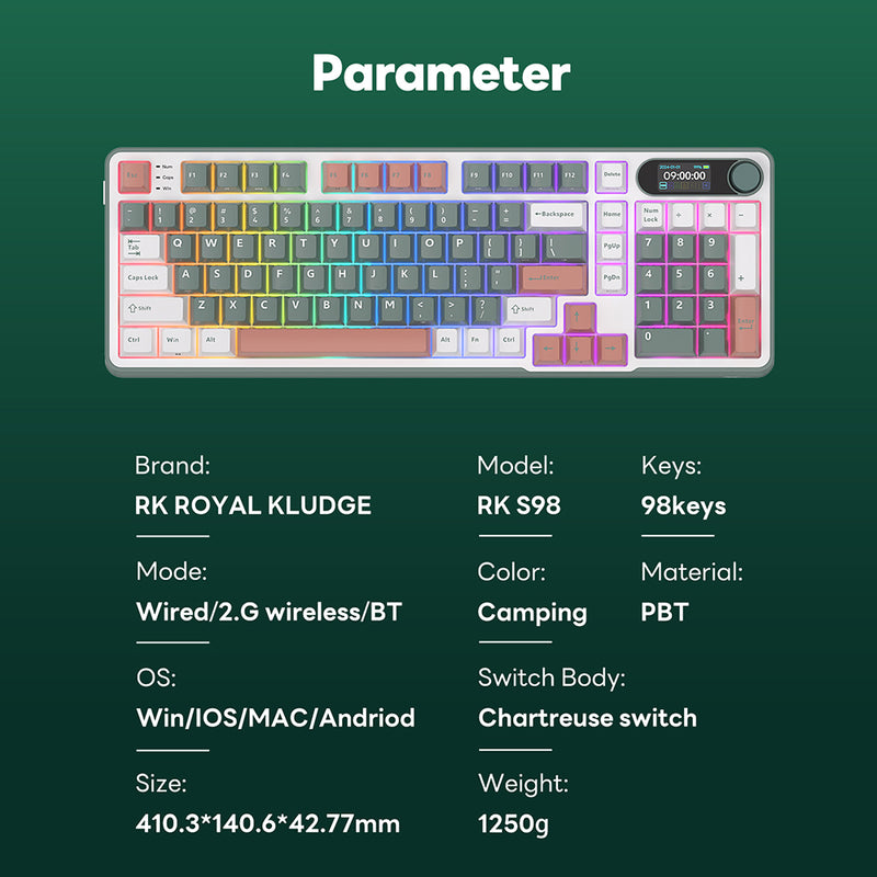 Daarnaast voegt het display van de RKS98 een nieuwe laag van functionaliteit toe door geavanceerde mogelijkheden zoals het weergeven van meldingen voor inkomende berichten of e-mails. Dit draagt bij aan een verbeterde gebruikerservaring, of je nu aan het werk bent, aan het gamen bent of gewoon geniet van een typsessie. Met zijn geïntegreerde display biedt de Royal Kludge RKS98 een innovatieve en veelzijdige typervaring voor iedereen die op zoek is naar meer controle en gemak in hun toetsenbordervaring.
