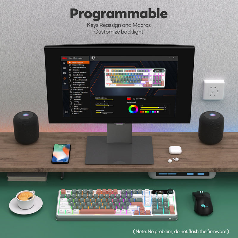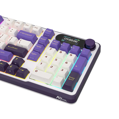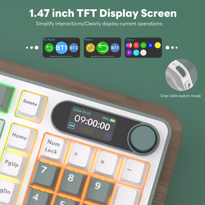 Het Royal Kludge RKS98 toetsenbord beschikt over een intuïtief display boven het toetsenbord, waardoor gebruikers direct toegang hebben tot belangrijke informatie en functionaliteit. Met real-time feedback kunnen gebruikers snel en gemakkelijk informatie aflezen, zoals verbindingstatus, batterijniveau (voor draadloze modellen) en volumeniveaus. Dit display biedt ook de mogelijkheid om instellingen aan te passen en aanpassingen te maken zonder de software te openen, waardoor een naadloze en gepersonaliseerde gebruikerservaring mogelijk is.